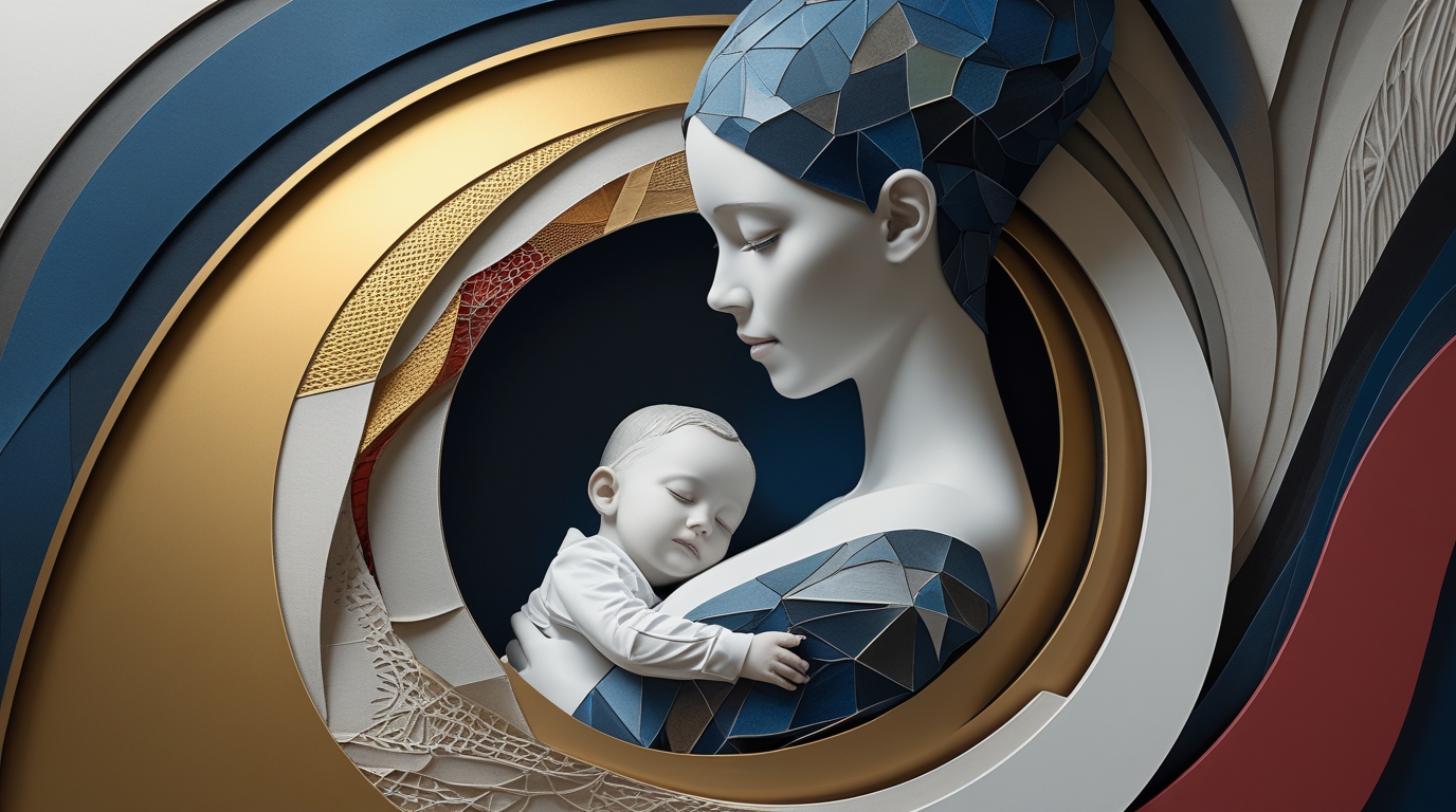 abstract mother and child art, architectural motherhood figurative painting, modern abstract figurative artwork, luxury digital oil painting, symbolic maternal love art, contemporary family fine art, sculptural texture abstract art, museum grade motherhood artwork, iconic maternal bond art, premium abstract figurative painting