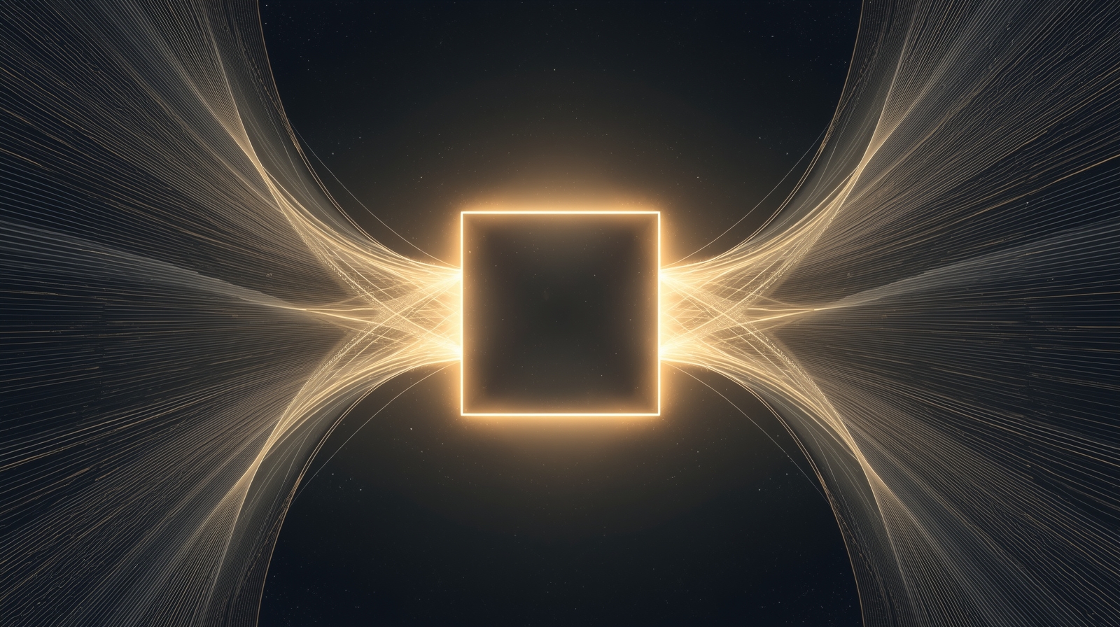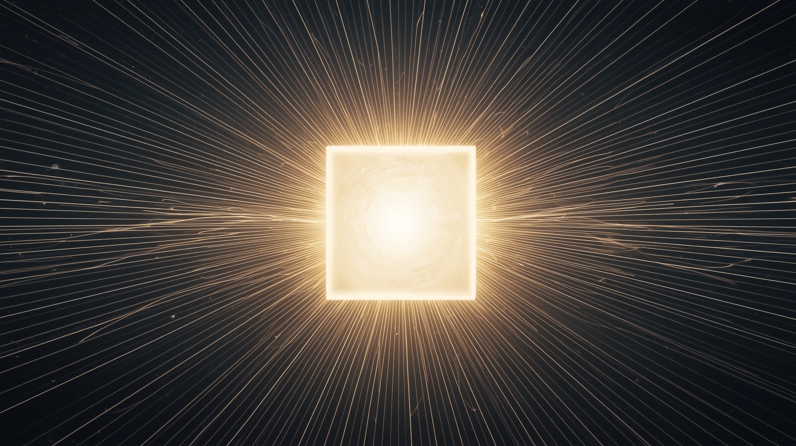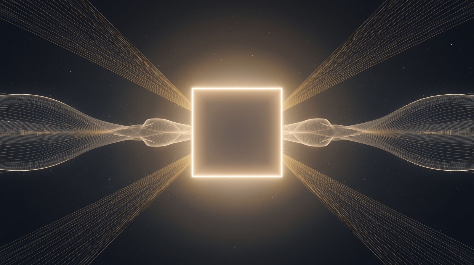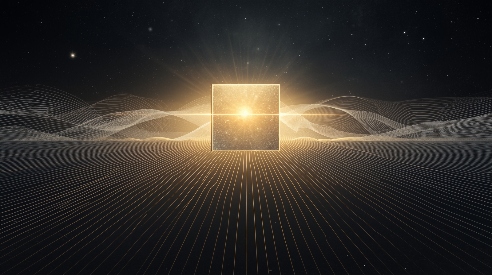 This artwork showcases a radiant floating square glowing like a heavenly gate, surrounded by perfectly aligned golden waves. The elegant white-and-gold intersecting lines add structure and spiritual symbolism, blending chaos and harmony. A deep cosmic background with subtle star glimmers enhances the mystical atmosphere. Crafted with hyper-detailed textures and refined lighting, this piece delivers a museum-quality presence ideal for modern luxury interiors.