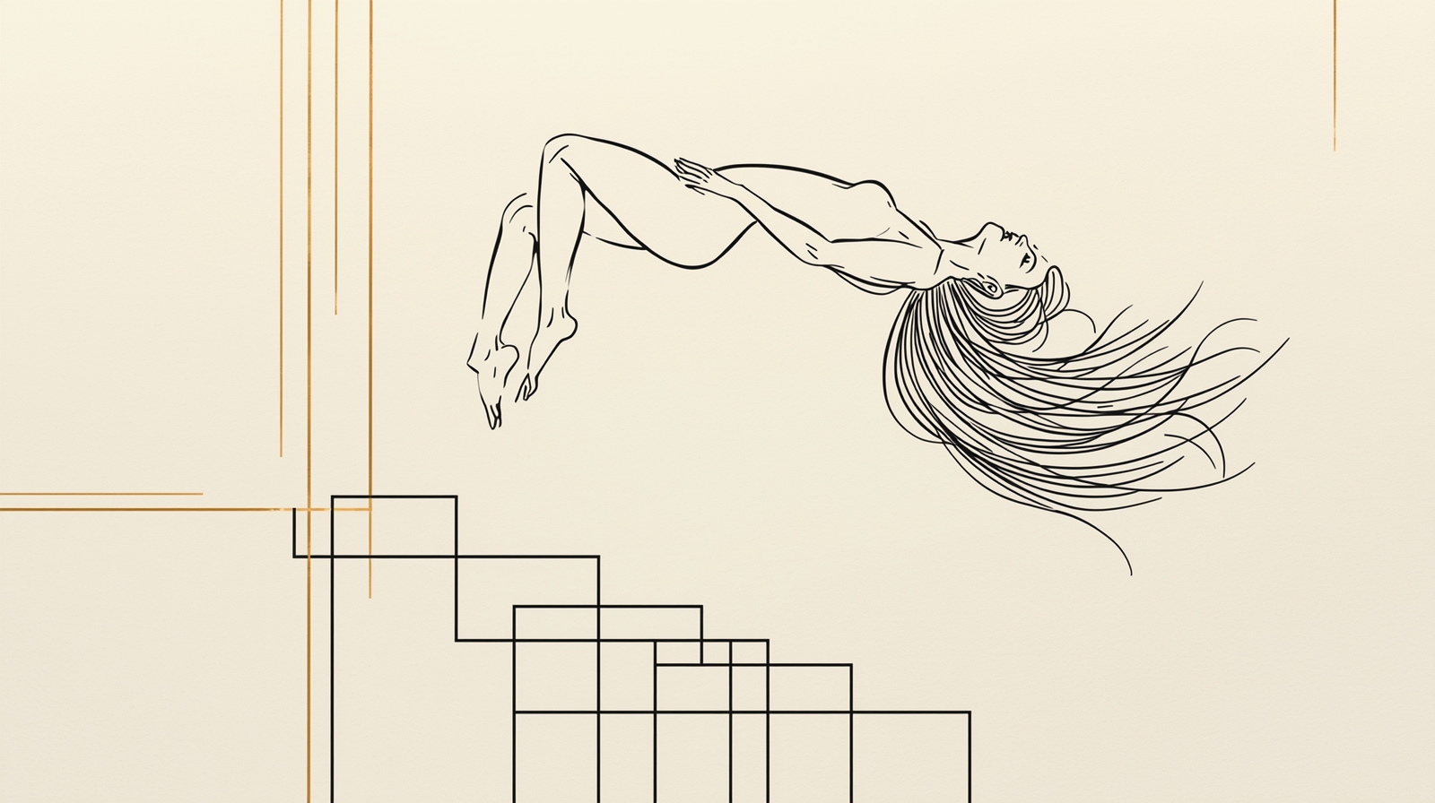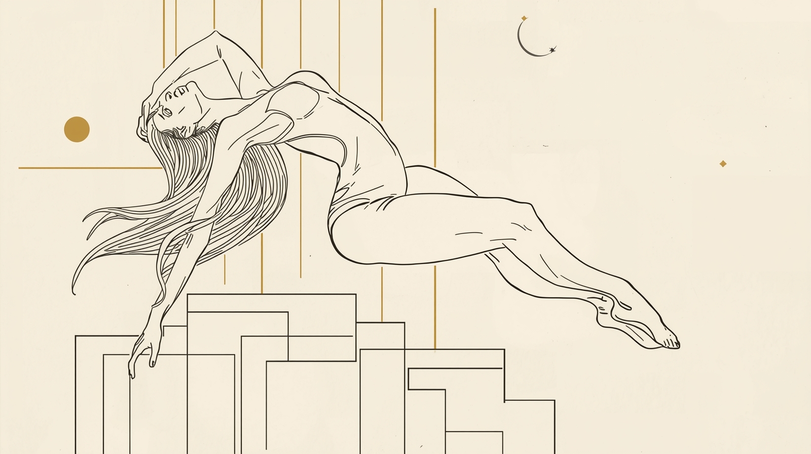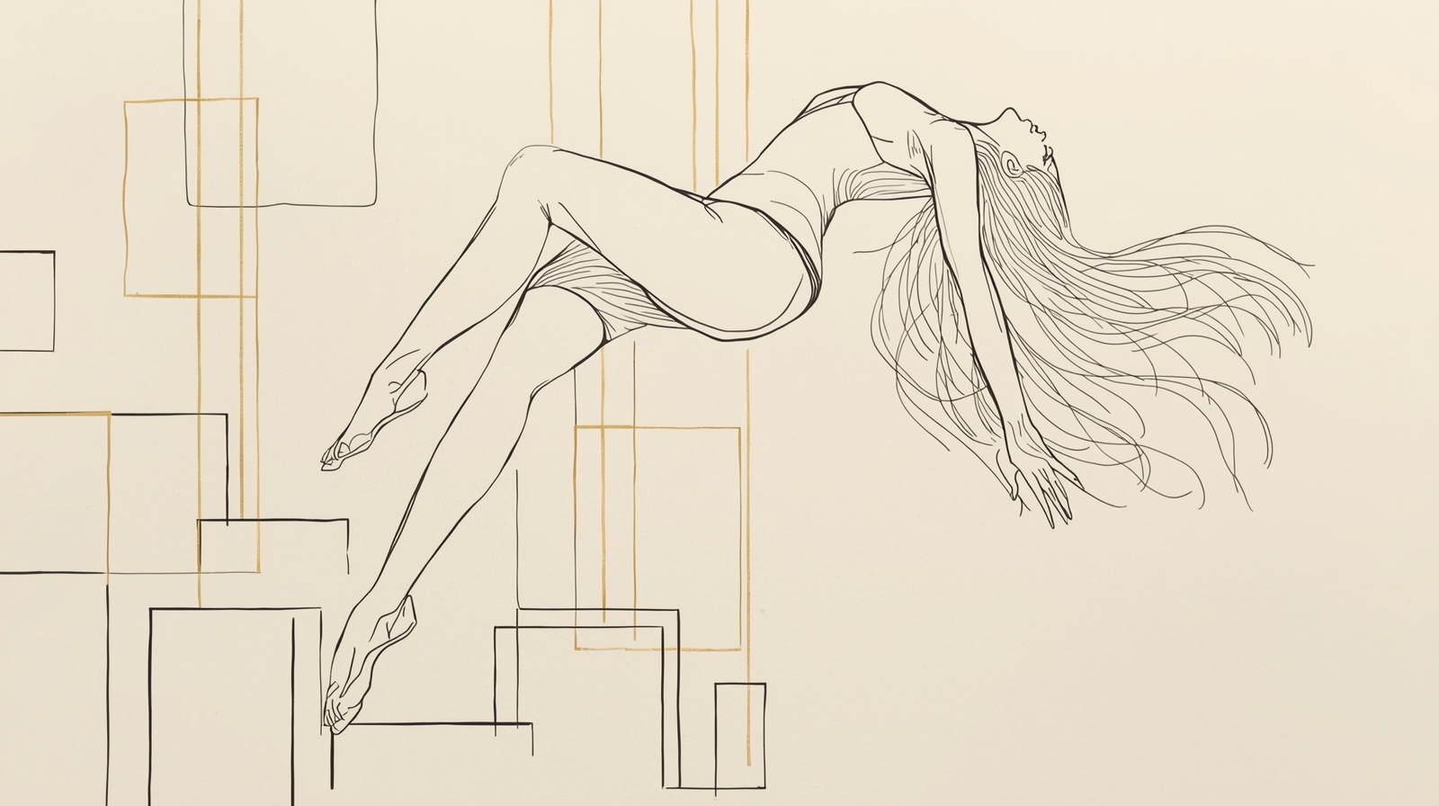 Beneath her, soft geometric blocks and thin gold-accent rectangles create a luxurious celestial backdrop, enhancing the sense of floating beauty and high-fashion energy. Set on textured ivory museum-grade paper, the composition radiates ultra-hot feminine presence, minimalist sophistication, and premium gallery style.
