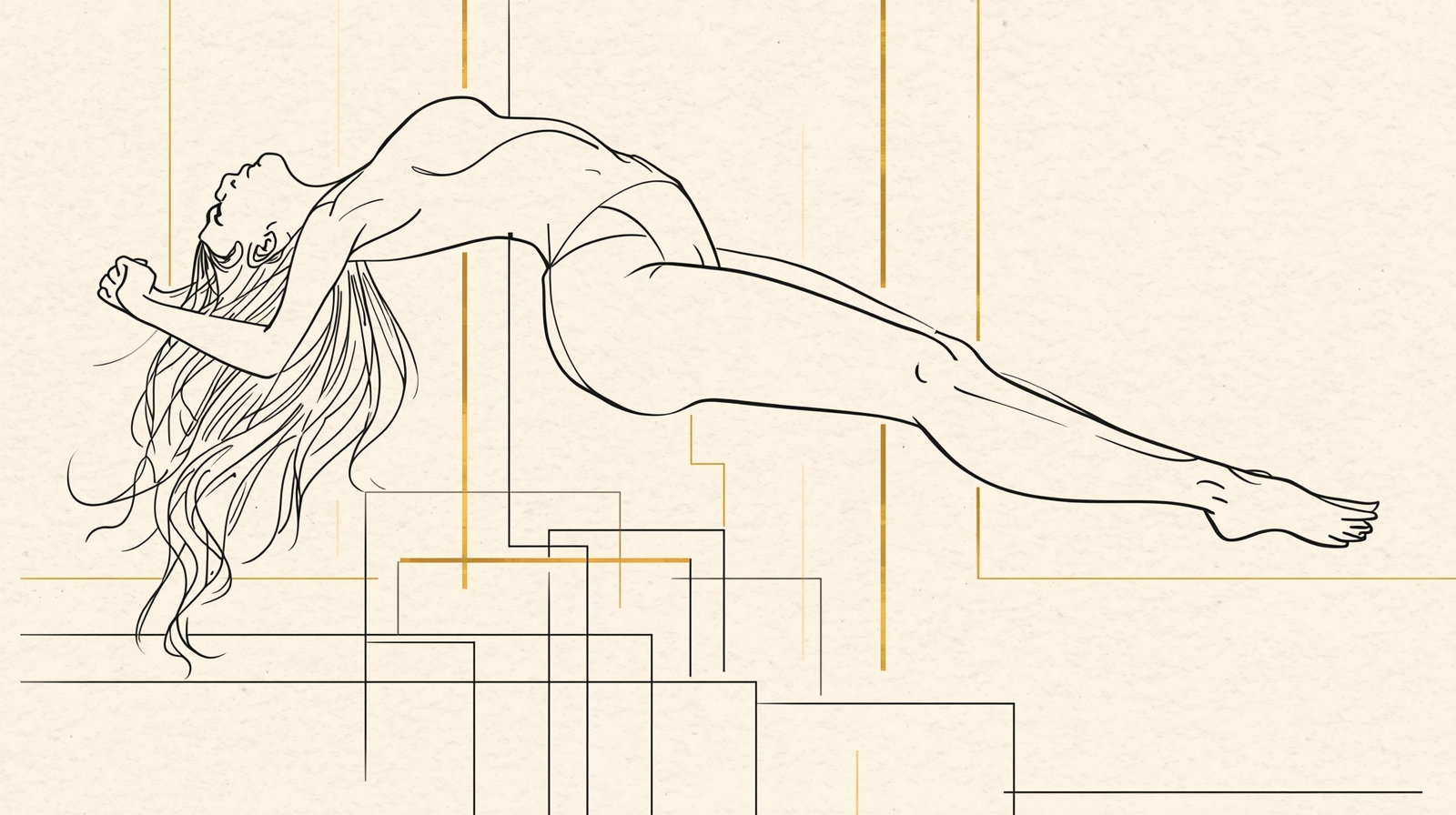This artwork captures a high-fashion single-stroke line drawing of a confident, sensual woman flying weightlessly through the air, her body arched in a deep, graceful curve like a floating goddess. Bold flowing lines exaggerate her hips, waist, and feminine contours, creating a dynamic, sculptural elegance without revealing explicit detail.