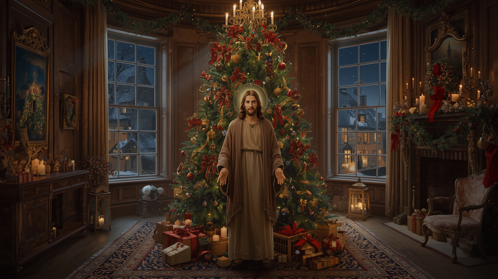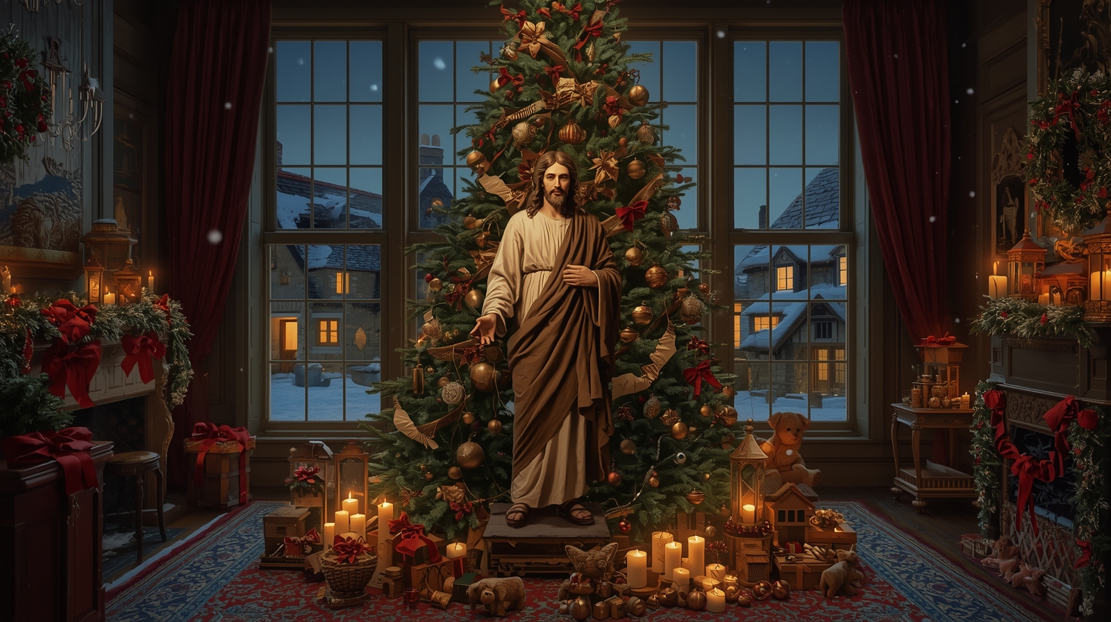 This ultra-high-resolution museum-quality digital oil painting is inspired by late Victorian to early Edwardian English art (1881–1930). The artwork presents a harmonious Christmas scene blending an elegant English manor interior with a peaceful vintage European village at night. At the emotional center stands Jesus Christ, portrayed with complete realism, a clear and natural face, calm expression, and perfectly balanced human proportions—free from blur, distortion, or duplicated features.
