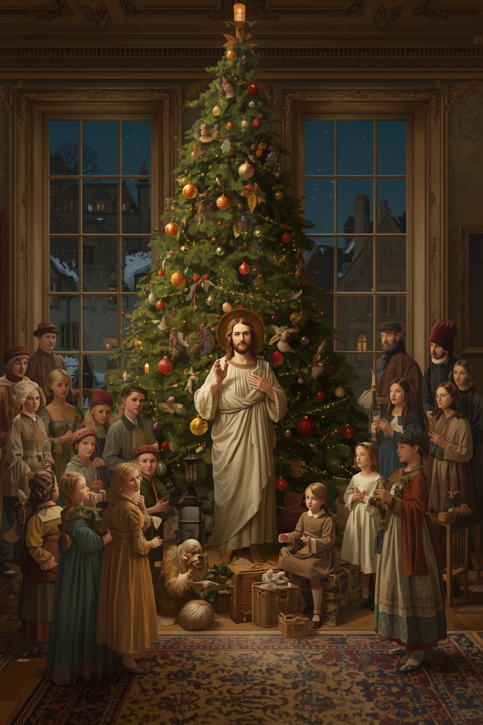 A richly decorated Christmas tree illuminated by candlelight anchors the scene, while ornate interiors and softly falling snow beyond open windows add warmth, depth, and cinematic contrast. Designed for collectors, galleries, and luxury wall art printing, this timeless Christmas artwork captures spiritual serenity, family unity, and classic Victorian elegance.